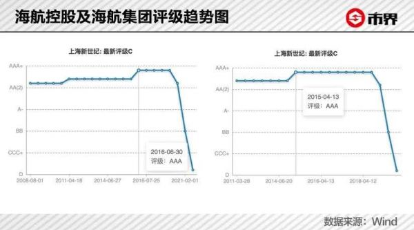 2011年上海新世纪资信评估投资服务有限公司(以下简称“上海新世纪”)首次接受委托,对海航控股的“11海航01、11海航02”两份债券进行跟踪评级,分别给出“AA+”“稳定”的评级和展望评级,这一评级一直维持到2014年(下图左)。