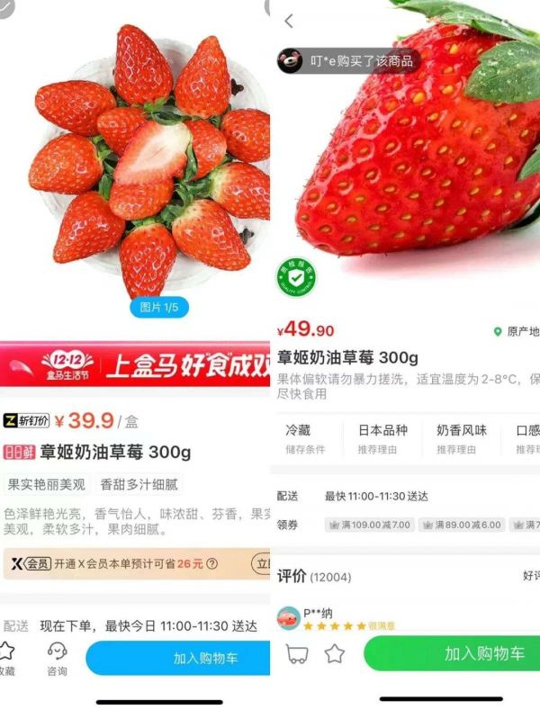 以300g的奶油草莓为例,盒马斩钉价39.9元/盒,而叮咚买菜费用在49元/盒。