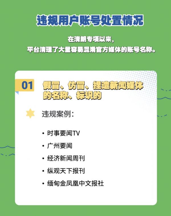 本次被清理的违规用户账号包括:假冒、仿冒捏造新闻媒体的名称、标识的;擅自使用热点、头条、在线、瞭望等具有新闻媒体属性的名称信息的;擅自使用、关联行政区划地名,打着“某某地某事”“某某智库”等旗号以假乱真、误导公众的。