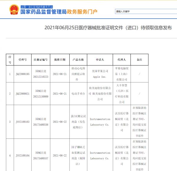 IT之家获悉,国家药品监督管理局今年 6 月份发布了 2021 年 06 月 25 日医疗器械批准证明文件(进口)待领取信息,其中第一项是美国苹果公司 Apple Inc 的移动心电图房颤提示软件,注册证编号为国械注进 20212210223。