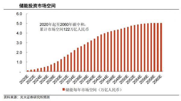 《每日经济新闻》记者注意到,目前市场普遍对储能发展的前景相当看好。光大证券测算称,2030年储能需求空间可达到1.25Twh(亿千瓦时),2020年-2030年累计3.9TWh。2030年储能市场空间有望达到1.3万亿元,到2060年有望达到5万亿元。