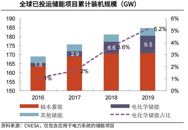 根据中关村储能产业技术联盟统计,截至2020年上半年,全球已投运储能项目累计装机规模185.3GW,同比增长1.9%;其中抽水蓄能累计装机占比最大,占92.3%;其次为电化学储能,占比5.5%。