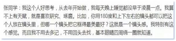 “张同学”刚开始火的时候,有人说他是吉林艺术学院导演专业的研究生,一些评论开始“恍然大悟”——怪不得这么专业,理所当然!但这个信息在前几日新京报的专访里被“张同学”辟了谣——“九年义务教育都还差一年没念完”。