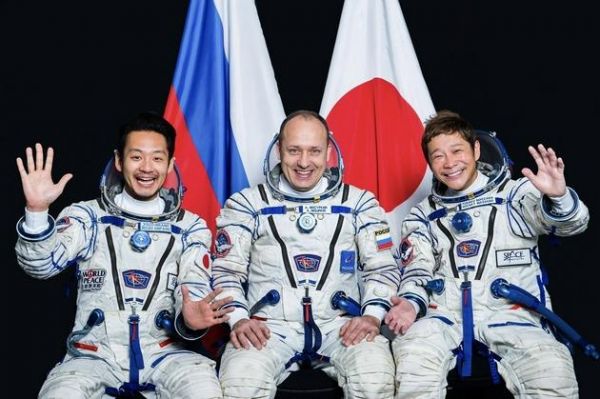 乘坐MS20的三名宇航员。从左到右分别是平野洋三,亚历山大·米苏尔金与前泽友作。