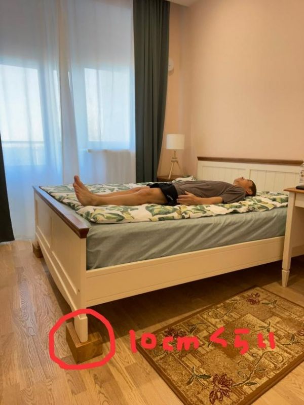 前泽友作之前在社交媒体发布其训练的照片,比如这张在床腿下面放一个10厘米高的木块,使床脚高头低,让他睡觉时血液流向头部。