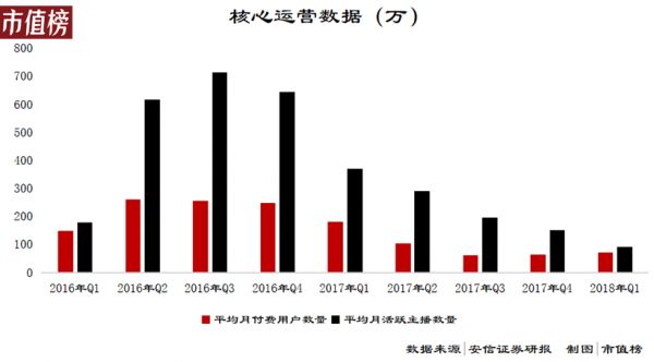 从2016年第二季度,映客平均的月均付费用户数量达到262万的峰值之后,就掉头直下,进入2017年加速下滑,到2018年Q1,已经降至73万人。