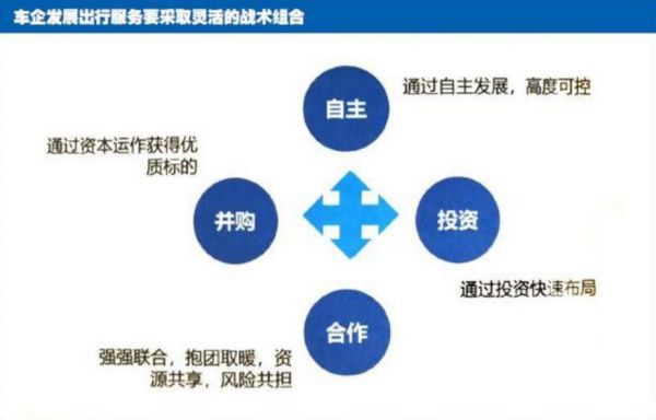 目前汽车企业布局出行领域有四大途径:自主、投资、合作和收购,形式以网约车、分时租赁、P2P租车这几类为主。但需要注意的是,这其中每一种运营形式都处在探索之中,还没有成为一个成熟的、可持续的商业模式。