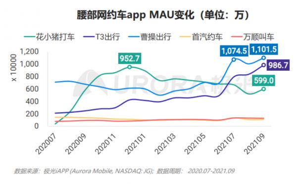 根据移动互联网数据平台极光大数据三季度报告显示:曹操出行月活用户上升为1101.5万,T3出行为986.7万。与2021年一季度相比,增长均接近一倍。曹操出行也成为继滴滴之后,首个突破千万月活用户大关的网约车出行平台。