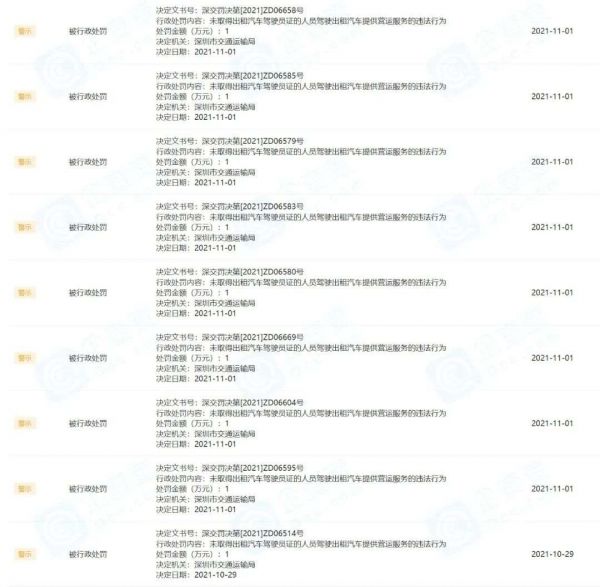 企查查数据显示,从今年10月11日以来,曹操出行运营主体杭州优行科技有限公司的行政处罚记录快速攀升,仅在11月1日,曹操出行就连续接到8条行政处罚消息。