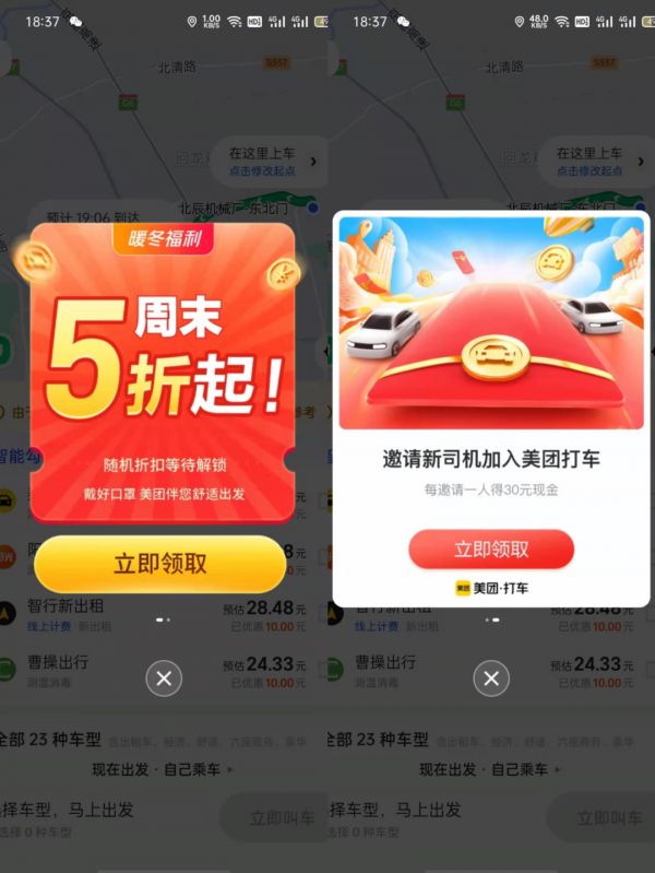 新浪科技在美团打车App上看到,针对司机,美团打车推出了邀请新司机加入,每邀请一人得30元现金的奖励;而针对用户,也有周末5折起、金额不等的优惠券等补贴。