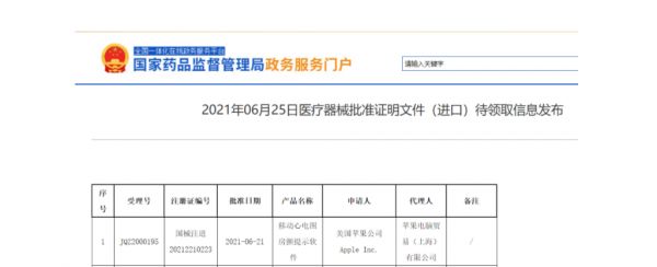 在今年6月份国家药品监督管理局发布的医疗器械批准证明文件(进口)待领取信息中,我们可以看到美国苹果公司的移动心电图房颤提示软件,注册证编号为国械注进20212210223,这一批准文件基本保证了Apple Watch ECG功能能够在国内上线。最终在经过了将近半年的调整后,该功能才得以在国行Apple Watch中出现。