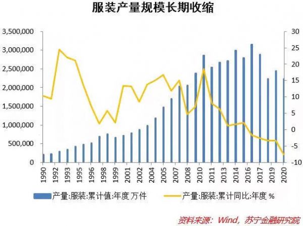 图:服装产量规模长期收缩(来源:Wind,苏宁金融研究院)