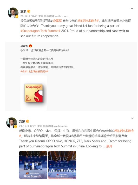 高通总裁安蒙在微博上的操作也让网友们更加坚信小米才是官方“钦点”的首发厂商。因为安蒙先是转发了雷军官宣小米12首发骁龙8的微博,第二天又在微博中感谢了包括小米在内的一系列合作伙伴,但唯独没有提及联想。