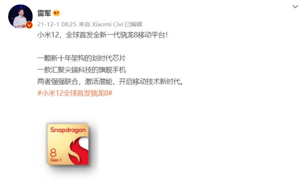 雷军在文章中依然强调,小米12将全球首发最新的骁龙8旗舰平台,同时表示“首发不是拿来主义,更不是博彩头的PPT技能,而是对行业、对用户的一份承诺和责任”。