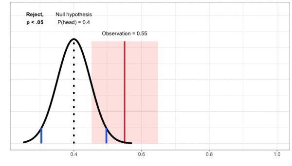 否定域。给测试建立决策规则的另一种方法是根据所谓的“拒绝域”——我们得出结论认为硬币是不均匀的一组值。为了计算拒绝域,我们再次假设原假设为真(硬币是均匀的),然后将拒绝域定义为概率总和不超过 0.05 的最不可能结果的集合。拒绝域由最极端的结果组成,前提是原假设是正确的——是拒绝原假设的证据最强的结果。如果观测值落在拒绝域内,我们就可以得出结论,存在统计上显著的证据表明硬币是不均匀的,并“拒绝”零假设。在那个抛硬币实验的情况下,拒绝域对应于观测到正面朝上的情况少于 40% 或超过 60%(如图 3 的蓝色阴影条所示)。我们称拒绝域的边界,本例情况下为正面朝向占比为 40% 与 60% ,为测试的临界值。