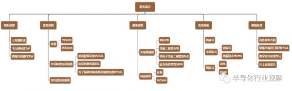 根据激光发射装置的不同又可将激光雷达分成光源波长和发射器种类两种方式。光源波长主要分为 905nm 和 1550nm 两类,发射器又包含边发射激光器 EEL、垂直腔面发射激光器 VCSEL 与光子晶体结构表面发射激光器 PCSEL 三种主流方向。