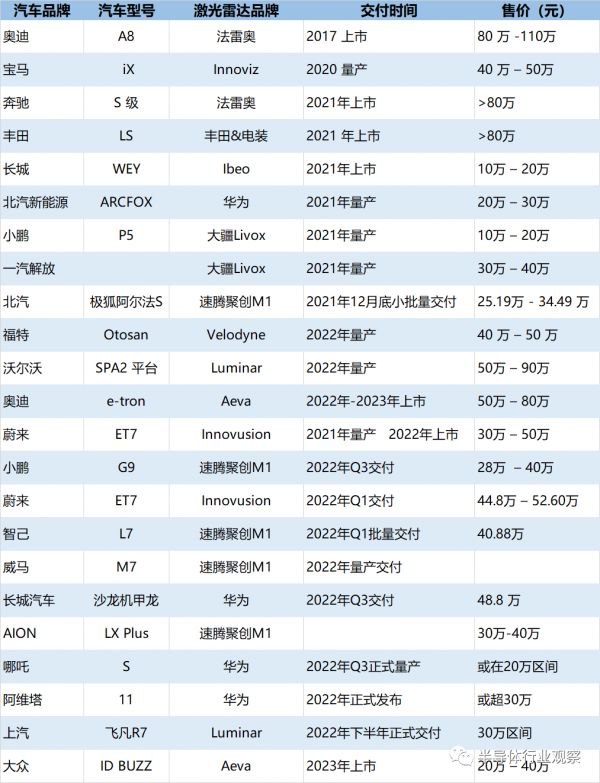 据笔者统计,截至目前,宣布搭载激光雷达的车企已超23家,这些车型的交付时间基本集中在2021年底到2022年,从售价上来看,豪华轿车价格普遍在 80 万以上,其余售价也大多在30-80万之间。