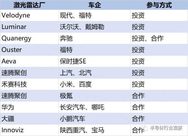 由于激光雷达技术路线众多、不确定性较大,若为并购或自行成立事业部会存在内部排他性约束,为了避免这种情况的产生,整车厂多通过投资或合作的方式参与激光雷达领域中。