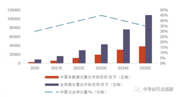 随着自动驾驶级别的提高,激光雷达已成为大多数车企实现L3及以上级别自动驾驶的必备传感器,上车已是弦上之剑。根据 Yole 预测,到2025年中国乘用车领域激光雷达市场空间将会达到378.8亿元,全球乘用车激光雷达市场将达到1082.2亿元,中国市场占全球比重较高,将达到 35%。