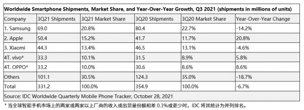 iPhone作为苹果公司重要收入来源,占苹果总收入比例近五成。截至2021年9月25日的2021财年第四季度,iPhone营收388.7亿美元,同比增长47%。该季度,iPhone出货量达5040万台,同比大增20.8%,凭借15.2%市场份额位居全球第二,该数据来自IDC。需要指出的是,全球智能手机出货量下滑的局面下,iPhone依旧保持强劲增长态势。IDC数据显示,2021年第三季度,全球智能手机出货量同比下降6.7%,出货量为3.3亿台。