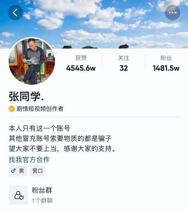 垂类达人在入局直播电商之前,往往已经在内容领域深耕多年,在自己的所属垂类闯出了一片天地,他们的优质内容也为他们吸引了不少粉丝的关注和喜爱。以@张同学. 为例,他的优质内容目前已经为他吸引到了近1500万的粉丝,这样的粉丝基础,很容易为他实现直播带货的冷启动。
