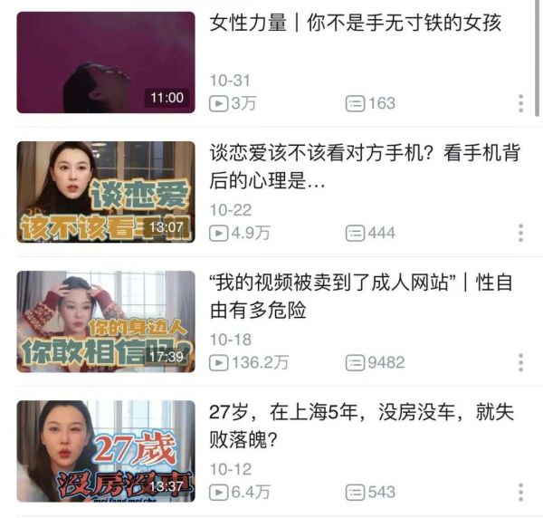 我们也可以在她的视频中看到更多的女性视角,比如“家暴妇女的绝望”、“你不是手无寸铁的女孩”、“女性安全何以实现”等等主题,都是她日常输出的观点。在这些讨论女性相关问题的视频中,她同样会引经据典,在输出观点的同时用自己所看过的书作为佐证,丰富视频内容,也向粉丝们传递着正向的价值观。
