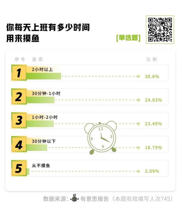 在有意思报告发起的一项调查中,30%的人每天在上班时用2小时以上的时间摸鱼,占比最高。从不摸鱼的,仅有22人。