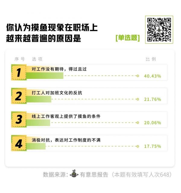 在有意思报告的调查中,40%的人认为摸鱼现象普遍的原因是贵工作没有期待,得过且过。