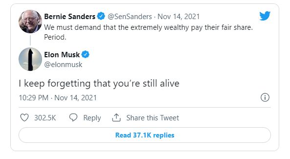 与此同时,当美国参议员伯尼·桑德斯(Bernie Sanders)呼吁“超级富豪支付自己的那一份”时,马斯克在下面留言说:“我老是忘了你还活着。”
