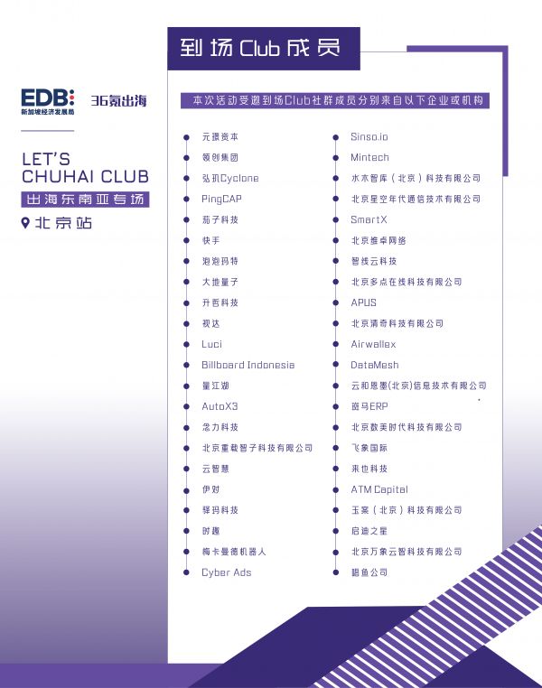 今年9月份,由新加坡经济发展局(经发局 EDB)与36氪出海联合主办的“LET'S CHUHAI CLUB-出海东南亚系列沙龙” ,正式起航,先后于成都、上海、深圳与该地区超过100家中国出海企业进行深刻且有温度的交流。这次,LET'S CHUHAI CLUB-出海东南亚系列沙龙将于12月16日来到北京。作为出海东南亚系列沙龙在今年的最后一站,我们希望继续为有志于出海东南亚的企业提供有价值的交流平台。
