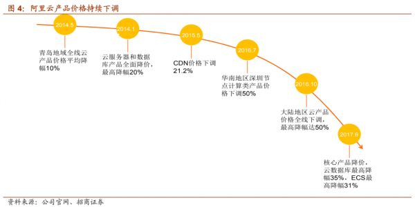 由于率先实现了规模化,自2014年至今,阿里云每年降价十余次,年降幅高达30%。