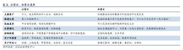 两者的核心区别在于数据中心的主导权。公有云的数据中心一般由云服务供应商提供,而私有云服务方式下,数据中心一般为企业自建或私有云厂商承建并运营,混合云则是企业的不同IT系统分别使用私有云和公有云架构。