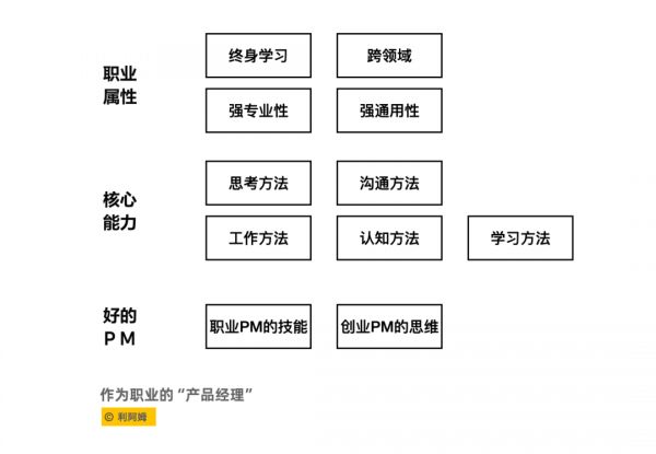 产品经理的核心能力是关于方法论的,正确的思考方法、正确的沟通方法、正确的工作方法、正确的认知方法、正确的学习方法,如果能掌握正确的方法论,那就具有了跨领域的通用性。