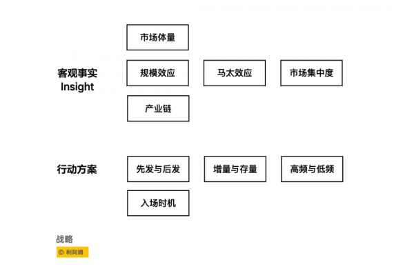 制定战略要关注的要素:市场体量、规模效应、马太效应、市场集中度、产业链、先发优势与后发优势、增量与存量、高频与低频、入场时机。