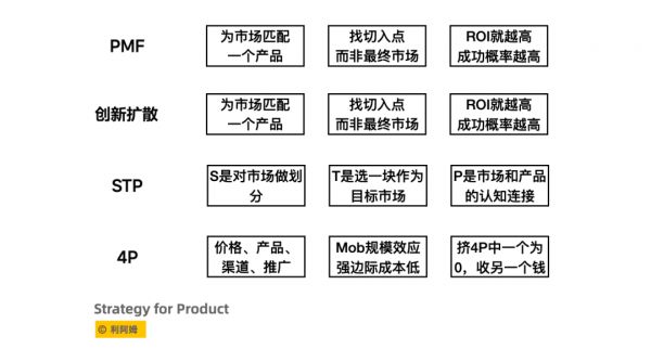 涉及到四个概念,PMF、《创新的扩散》、STP、4P,这四个概念之间是互相影响互相印证的关系。一个产品或者一个业务最优雅情况下,会同时符合了这四个概念的理论。