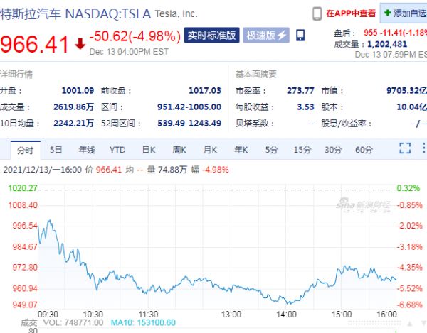 截至12月14日收盘,特斯拉股价跌破千元关口下方,报966.41美元/股,收跌4.98%。相比上一个交易日,506亿美元市值蒸发(约3220亿人民币)。