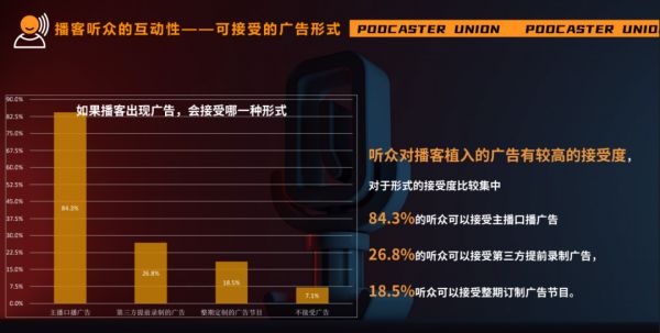 根据PodFest China发布的《2020中文播客听众与消费调研》显示,50.7%的播客用户承认,播客节目曾影响过他们的消费行为,比如购买播客中提到的产品,或者去主播推荐的咖啡厅或者酒吧等;同时,超八成用户对播客商业化持支持态度。播客公社《2021播客听众调研报告》也显示,84.3%的听众可以接受主播口播广告,26.8%的听众可以接受第三方提前录制广告,这也说明了播客营销具有较大的想象空间。