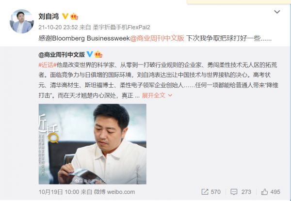 2021年10月,刘自鸿在微博上转发了媒体对他的个人专访。