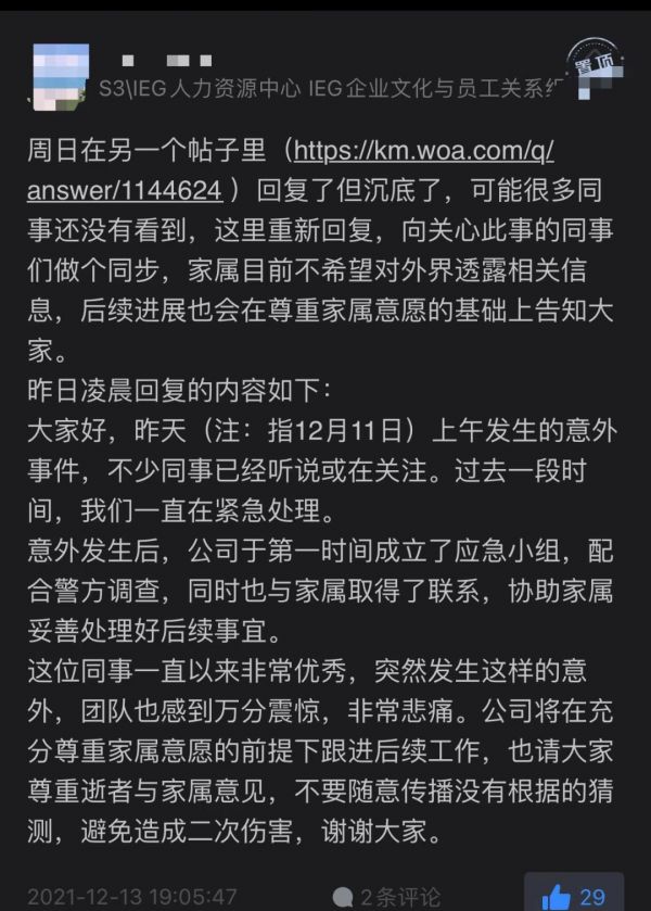 腾讯方面称,得知毛星云去世后,公司成立了应急小组,配合警方和家属进行处理。12月12日,HR于内部论坛KM同步了事件的简要情况,并于12月13日再度发布说明:
