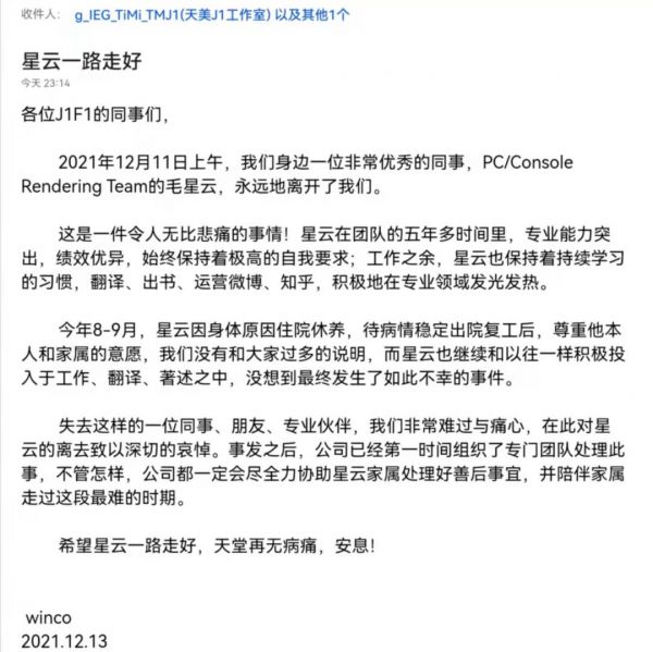 12月14日,针对外界关于「天美F1工作室引擎组组长毛星云意外身故」消息的问询,腾讯予以了回应。