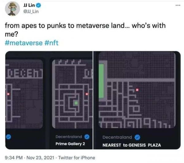 11月23日,歌手林俊杰在推特上展示了他新购买的三个虚拟地块,共花费约12.3万美元。这三块土地并非位于中国或新加坡某座城市,而是在虚拟平台Decentraland(以下简称“DCL”)。