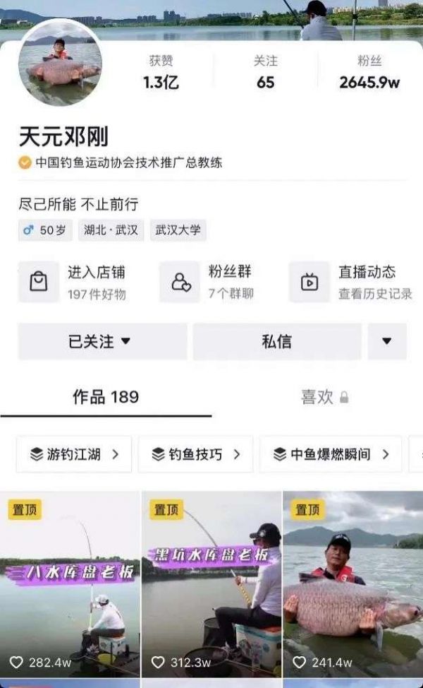 这是在抖音和B站上都开有账号的中国钓鱼运动协会技术推广总教练天元邓刚,今年5月发的一条视频。视频在抖音上共获得6.5亿次观看,312.3万的点赞,这让天元邓刚的账号单月涨粉近千万。