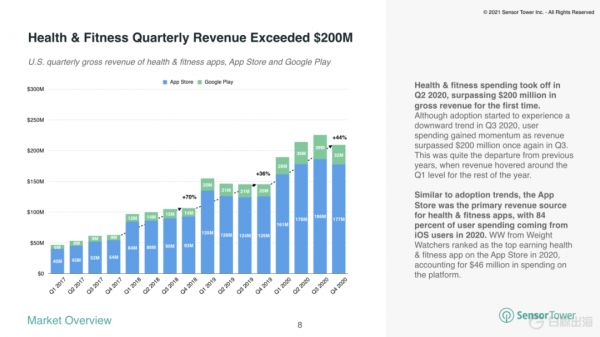 以增长最明显的健身健康类赛道为例,根据 Sensor Tower 的数据显示,2020 年美国用户在健身健康类 App 中的支出连续三个季度创下新的记录,并且 2020 年全年在这一类别下的支出达到 8.38 亿美金,同比增长 42%。