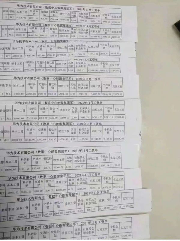 12月15日消息,一张写着“华为技术有限公司”的工资条引发网络热议。图片显示,职称为“高工”的员工一个月基本工资平均在5万元上下,累加绩效后实发工资超过10万元,部分人员的月薪甚至超过20万元。对此,华为回应称,这张图中存在不少漏洞,首先是华为不会给员工发工资条;其次公司名字也写错了;另外,华为公司内并无“高工”一职的说法。(AI财经社)