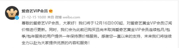 36氪获悉,爱奇艺VIP会员微博消息,12月16日0:00起更新黄金VIP会员订阅价格。同时,为此前已购买且尚未取消前述连续包月/包季/包年服务的用户提供一年保持原价格服务。对此爱奇艺回应:“视频平台的会员订阅价格一直偏低,这一现象已影响到了行业的健康发展。为了建立更加良性的产业生态,让优秀的内容生产者有所回报,最终为会员提供更多、更好的内容,我们决定对会员价格做出调整。”