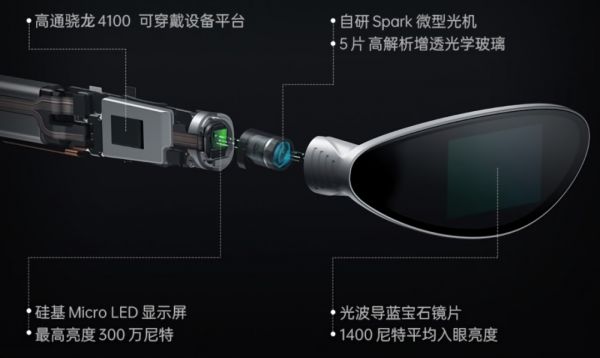 正因如此,OPPO Air Glass的硬件配置可能比你想象的要逊色不少。根据官方介绍,该机采用高通骁龙4100处理器——这是高通去年发布的可穿戴设备芯片,在性能方面基本不用做什么期待。