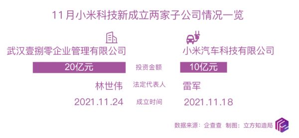 与之对应的,是今年11月,小米科技新成立两家企业,其中小米汽车有限公司的法人为雷军。 这家公司的注册资本达10亿元人民币。