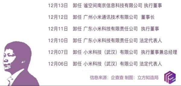 今年12月,雷军卸任6家小米系企业的高管职位。