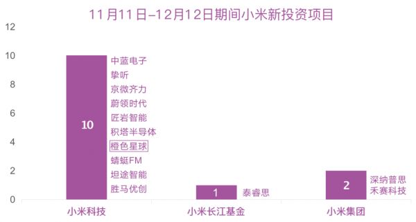 今年双11至双12的一个月间,以小米科技、小米集团、小米长江基金为代表的小米企业资本共投资了13个项目,其中有12个与AIoT相关。