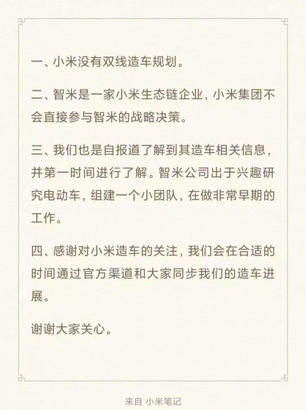小米的回应中,否认了双线造车,但确认了智米科技正在布局和电动汽车相关的工作。